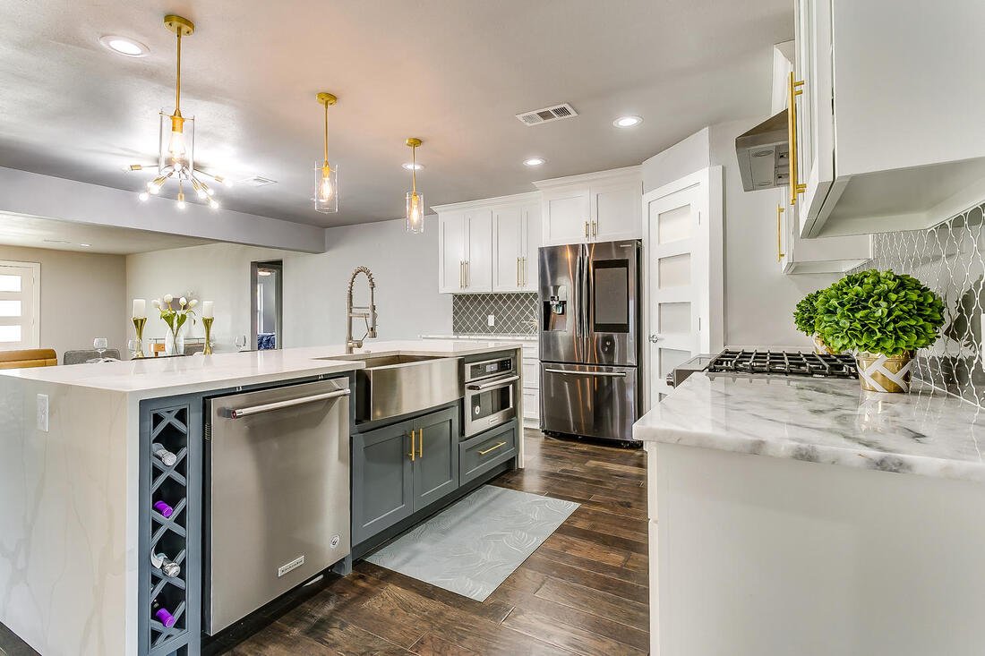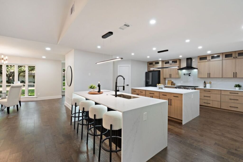 This spacious remodel showcases white shaker cabinets, a large center island, and matte black accents—seamlessly blending rustic charm with modern functionality.